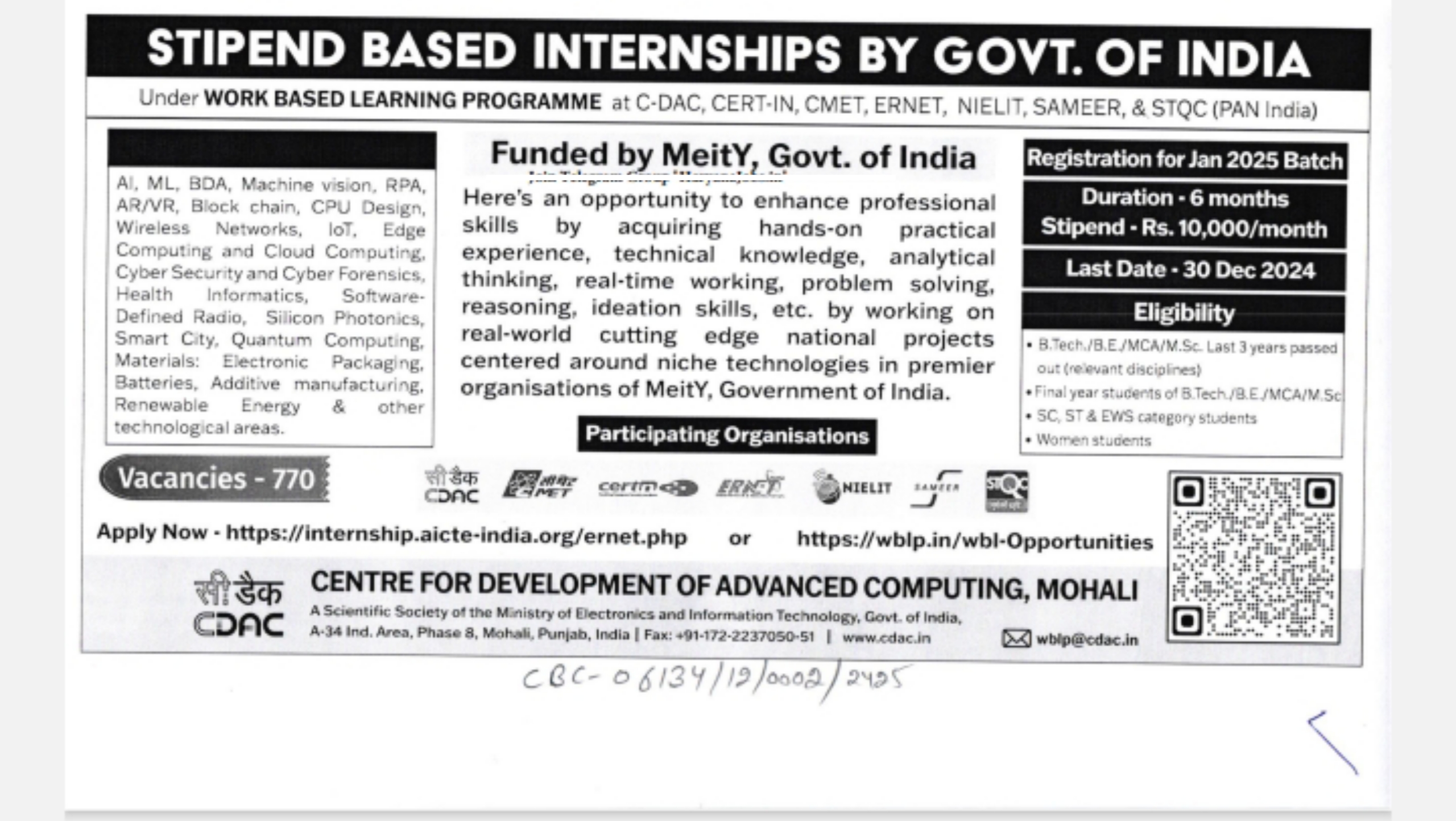 इसके आलावा इलेक्ट्रॉनिक्स और सूचना प्रौद्योगिकी मंत्रालय, भारत सरकार की तरफ से निकले गए 770 इंटर्नशिप पदों पर जनवरी 2025 से तकनीकी कौशल में परीक्षण दिया जाएगा।